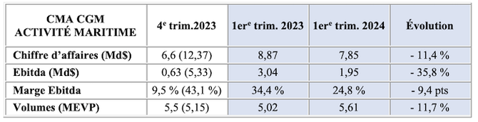 Au premier trimestre, le groupe est parvenu à transporter plus de conteneurs, soit 5,6 MEVP (+ 11,7 % par rapport au premier trimestre 2023), aidé « par le rebond de la consommation plus important que prévu et la reconstitution des stocks après une année de creux en 2023 », fait valoir le groupe.