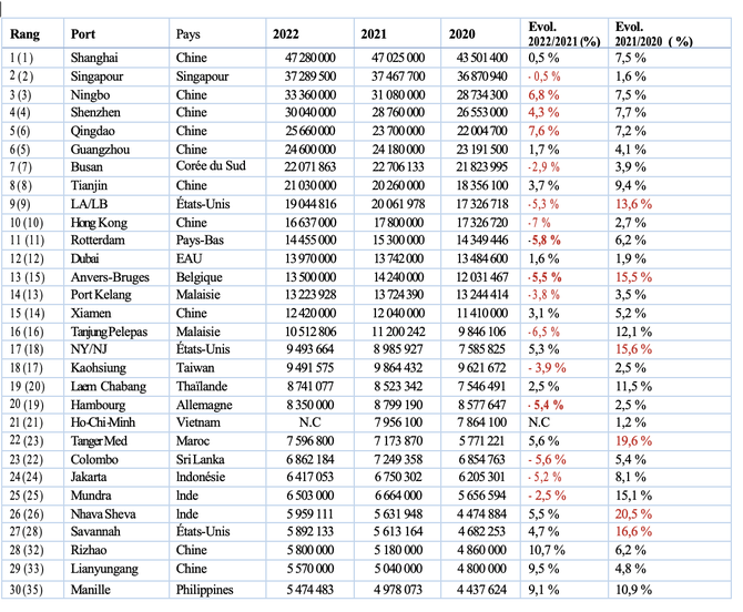 Rotterdam, Anvers-Bruges et Hambourg, les seuls trois ports européens d'un classement surplombé par 31 ports asiatiques (au sens large avec le sous-continent indien), s’illustrent par des pertes de 5,8 %, 5,5 % et 5,4 % respectivement. Le résultat est particulièrement sévère pour Anvers qui a fusionné avec le port côtier de Zeebrugge en avril 2022, dont la baisse réelle en 2022 devrait plutôt se situer autour de 6,5 %. Le débit des ports européens – 11e, 13e et 20e rang mondiaux –, est désormais inférieur aux niveaux de 2019.