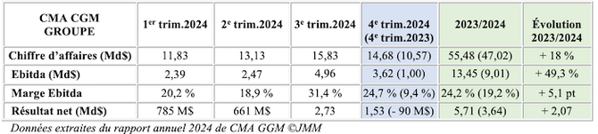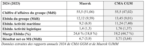 Le groupe a terminé l’année avec un chiffre d’affaires de 55,5 Md$, en hausse de 18 % par rapport à 2023 en dépit d’un recul sensible au quatrième trimestre par rapport à un troisième trimestre qui avait été dopé par la baisse des taux de fret initié à l’été 2024. Avec 13,4 Md$ de résultat opérationnel, la marge Ebitda de 24,2 % est en hausse de cinq points sur l’ensemble de l’année mais là encore, le quatrième trimestre a contribué à l’altérer puisqu’elle portait haut, à 31 %, au sortir de la période estivale. Une gageure toutefois dans un contexte où le détournement contraint par le cap de Bonne Espérance, alourdit considérablement le poste carburant (dont la facture s’élève entre 4 et 5 Md$). Le résultat net ressort à 5,7 Md$, soit un gain de plus de 2 Md$ en un an. Avec 1,5 Md$ de bénéfice après impôts, les trois derniers mois de l'année contrastent avec la perte de 90 M$ de l'an dernier à la même période.