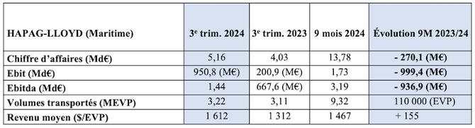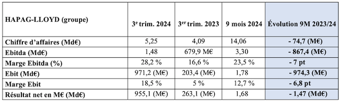 Hapag-Lloyd a conclu les neuf premiers mois de l’année avec un résultat opérationnel avant amortissement sur immobilisations (Ebitda) de 3,3 Md€ et un excédent brut d'exploitation (Ebit) de 1,78 Md€. Mais la bonne tenue du troisième trimestre n’a pas permis de compenser l’orientation du premier semestre si bien que, comparé à la même période de l’an dernier, le 5e armateur mondial de porte-conteneurs voit tous ses ratios nettement inférieurs. Son résultat net (1,68 Md€) est en perte de 1,47 Md€ et son Ebit, indicateur clé dans le conteneur, affiche un manque à gagner de près de 1 Md€ (cf. plus haut). À 14,1 Md€, les recettes du groupe ont été inférieures de 0,5 % à celles de l'année précédente, résultant de deux courbes qui ne vont pas le bon sens : baisse des taux de fret au premier semestre et augmentation des dépenses de transport.