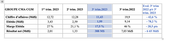 Entre avril et juin, son chiffre d’affaires s’était effrité de 37 % par rapport au deuxième trimestre 2022, à 12,3 Md$ tout de même. Entre juillet et septembre, il s’est dégradé un peu plus, de 42,6 % par rapport aux niveaux exceptionnellement élevés d’il y a un an, mais reste au-dessus de la barre symbolique des 10 milliards, à 11,4 Md$. Tous les indicateurs sont à l’avenant pour le groupe français de transport et logistique, numéro trois mondial dans le conteneur.