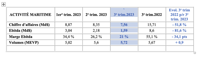 La seule activité maritime est sur la même trajectoire que celle du groupe, y contribuant toujours largement. À 7,6 Md$, le chiffre d’affaires a perdu la moitié de ses recettes par rapport à la même période en 2022, reflétant le retour des taux de fret au niveau d'avant la bulle.