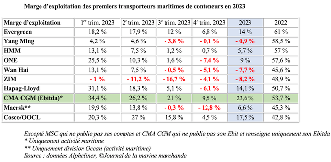En 2018, les marges opérationnelles dans le conteneur ont évolué entre - 3,1 et 1,4 % selon les trimestres. En 2019, entre 1,7 et 2,4 %. En 2020, entre 2,6 et 24,5 %. Si le caractère exceptionnel de la période pandémique devait encore être prouvé, il ne doit plus l’être. En 2021, la rentabilité financière des neuf géants du conteneur a éclaté, les marges évoluant entre 38,66 et 55,4 %. En 2022, elles ont oscillé entre 57,4 et 33,3 %. Et en 2023, année d'un retour à la normalisation, entre 13,1 et - 3,8 %.