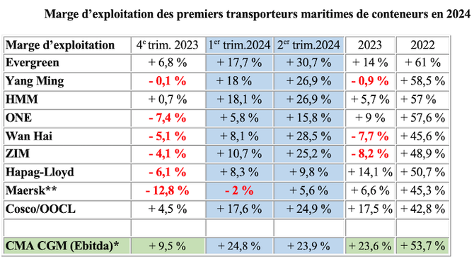 L’un d’entre eux, Wan Hai, a achevé son redressement à la fin de l'année dernière, après quatre trimestres de pertes en 2023 et de modestes bénéfices au premier trimestre. La compagnie a pourtant réalisé la deuxième marge la plus importante, à 28,5 %. « Wan Hai a pris livraison de 40 navires, ajoutant 265 000 EVP à sa flotte, au cours des deux dernières années, et, avec une base de coûts en hausse, aurait été confronté à des chiffres très différents sans l'impact de la mer Rouge », assène l’analyste Alphaliner.