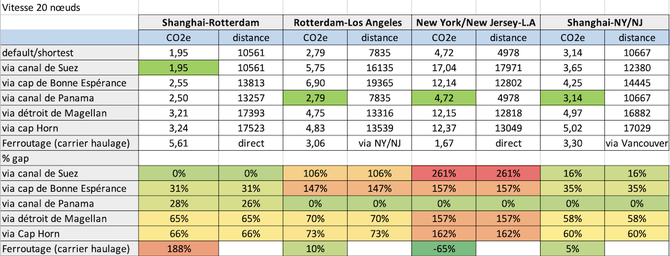 Il y a 10 525 milles nautiques (près de 20 000 km) qui séparent Rotterdam de Shanghai via le canal de Suez, soit un transit de près de 22 jours. Mais si le navire emprunte, le cap de Bonne Espérance, il devra parcourir quelque 7 500 km de plus, ce qui allongera la navigation de plus de huit jours s'il navigue à 20 nœuds (ce qui est une vitesse plutôt élevée, actuellement, nous sommes plus autour de 15 nœuds).